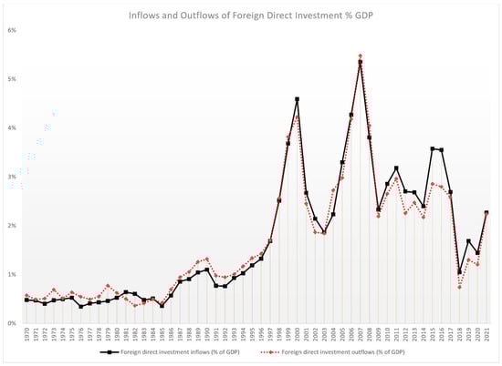 Investment Globalization 1972–2021: World Foreign Direct Investment Flows as a Percentage of World GDP; Source: World Bank (2023): World Development Indicators Series BX.KLT.DINV.WD.GD.ZS and BM.KLT.DINV.WD.GD.ZS.