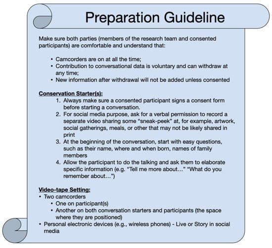 As Black Deaf Canada maintains a small collection of digital information (videos, photos), the research team gradually added to the documents we had collected prior to our research trip by choosing to visit Nova Scotia, New Brunswick, and Prince Edward Island. The team also developed clear and simple guidelines to follow when conducting conversations (see Figure 1 below).