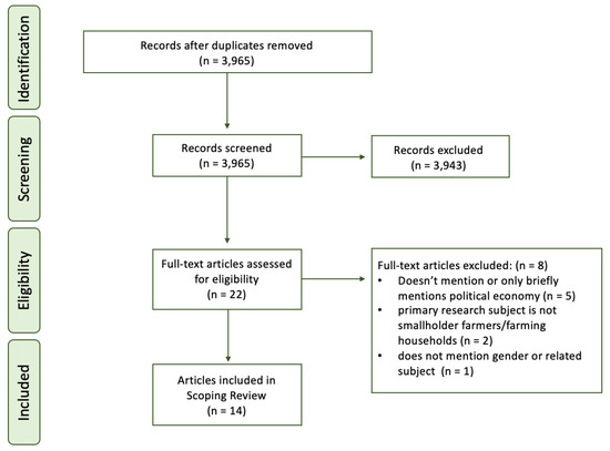 We employed a scoping review methodology using methods developed by Arksey and O’Malley. Scoping reviews are meant to address broad and under-researched topics and are intended to ‘map’ the existing literature in a given field. Our review is conducted to examine the extent, range, and nature of concepts of gender used in the political economy of agriculture literature, one of the key features of a scoping review (Arksey and O’Malley 2005). Keywords were pulled from the three main domains included in this review: political economy, gender, and agriculture. University librarians, one with an understanding of scoping methodologies and another with knowledge of gender and international development, were consulted in the creation of key terms and database selection. The search was conducted through April 2021 and was imported into Rayyan on 7 May 2021. The databases SCOPUS, Gender Watch, Gender Studies, and EconLit were used to locate articles. For complete terms, please refer to Table 1. Excluding duplicates, this search strategy yielded 3965 articles. No temporal or geographic restrictions were used. Because of this, studies published at any time and from all countries or regions were eligible for inclusion, though articles needed to be published in English. These restrictions placed on the search strategy were purposefully broad to capture the most literature available, as it was expected that there would be a shortage of literature which would meet the inclusion criteria.