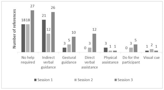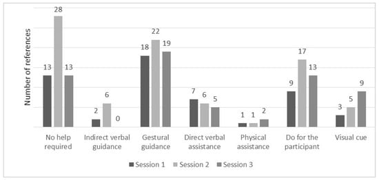 It is worth mentioning that the references coded as visual cues shown to participant A refer to those situations where caregiver A placed the cursor on the desired icon/symbol, e.g., “the caregiver places the cursor on the Music icon”. This occurrence was more frequent in the third session, as seen in Figure 1. It should be noted that there are very few references to physical assistance throughout the sessions, referring only to those situations when the caregiver tries to improve the child’s posture on the chair, to overcome difficulty in clicking on the icons (“The caregiver straightens up the child’s upper body and head”). However, in all sessions, there was a significant number of references to actions performed by the caregiver on behalf of the child, such as clicking to go back to a previous item and opening and closing grid sets and folders.