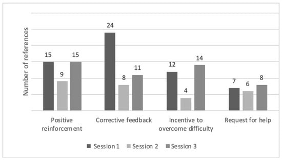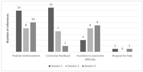 Concerning the interaction between caregiver and participant, Figure 2 shows that references coded as positive reinforcement are present in all sessions, both in verbal and gestural form, but were more frequent in the first session. Some examples are: “The caregiver says ‘Good’ and gestures OK”; “That’s right!”; “Very good!” In turn, there are also references to the child’s responding with happy vocalisations and smiles. Thus, these caregivers’ positive reinforcement produced joyful, positive responses, and it can be inferred that this fosters children’s self-fulfilment and motivation.