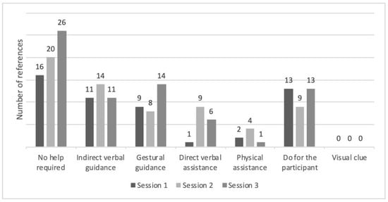 To analyse the content of the observed data in terms of the need for assistance to complete a task, the subcategories used to analyse the content of the sessions were based on the EFPT system of cues and help, which ranges from no cues required to indirect verbal guidance, gestural guidance, direct verbal assistance, physical assistance and, at the other extreme, performing the step on behalf of the participant.