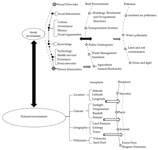 The term ‘environment’ refers to all of the things and humans that surround each individual. The two environmental dimensions are the natural and social environments (Tan et al. 2022). The natural environment is described as everything in the universe as God’s creation, which includes living and non-living things. The social environment is a group of people who live and interact with one another. Humans may have the same or different cultures, traditions, behaviours, religions, and ways of life. People form relationships with one another in a social environment based on their ideas, needs, and targets, which are guided by values, laws, and roles (Levy et al. 2021). Even though the natural environment is broader than the social environment, they are interconnected in such a way that each has an impact on the other (Scalsky et al. 2022) (Figure 1).