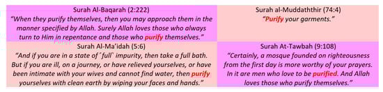 The Qur’an emphasises the importance of purifying ourselves, as well as practising a healthy lifestyle in a clean environment (Figure 3). There are three types of cleanliness in Islam: (i) purification from impurity (i.e., achieving purity or cleanliness by taking a bath ghusl or performing ablution wudu’ in conditions where a bath or ablution is required or desirable under Islamic Law; (ii) cleaning our body, dress, or surroundings of impurity or filth; and (iii) removing dirt from different parts of the body, including cleaning the teeth and nostrils, nail trimming, as well as armpit and pubic hair removal (Abd Rahim et al. 2018).