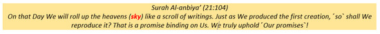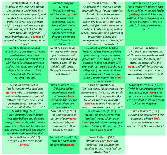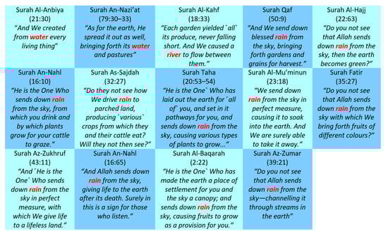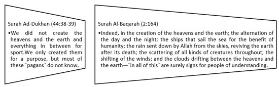 Islam emphasises that environmental protection is the only way to preserve the delicate balance of life and emphasises common interests, in contrast to Western concepts that view it as a reaction to outside factors and the pursuit of particular interests. The main difference between Western and Islamic views is the source of knowledge. The Western view is based on their own ideas and research on the subject, whereas the Islamic view is based on Divine revelation from the Qur’an, Hadith, and Sunnah from the Prophet Muhammad SAW (Nasir et al. 2021). The interaction between man and the environment is accompanied by a powerful desire to please Allah (Aral and López-Sintas 2022). The Qur’anic verses in Figure 5 demonstrate the relationship between nature and man, and this relationship inspires Muslim scholars to explore natural phenomena in order to better understand God (Wersal 1995).