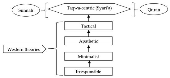 In terms of environmental preservation, companies have five levels of environmental responsibility (Salem et al. 2012). The first level is irresponsible, which represents an extreme behaviour of a company. In this case, the company shows no regard for the environment. Issues such as fraud, misrepresenting accounting statements, illegal disposal of toxic waste, and false advertisement illustrate irresponsibility by a company. The second level is minimalist, in which companies try to maximise profit and share value. The company complies with the minimum legal requirements. It may also take part in a few environmental activities. The third level is apathetic, in which companies adhere to the required ethical obligations and operate within the law. Doing what is right and avoiding harm can serve as representations of these obligations. Altruistic and philanthropic endeavours, as well as other social and environmental activities, are rarely carried out by the company. If such a company makes no strategic effort to engage in a corporate social responsibility scheme, it is referred to as apathetic. The fourth level is tactical, in which companies voluntarily fulfil their social responsibilities. This is advantageous both in the short- and long-term basis. When a company’s standing is raised, it eventually guarantees long-term profits. The fifth level is taqwa-centric, whereby Islamic values are applied by a company or institution. At this level, companies voluntarily engage in environmental activities, regardless of the financial implications, both positive as well as negative. At this point, religious duty serves as the key driver behind an environmental activity. Profit or company reputation is less significant than this religious obligation. Hence, the Islamic perspective on environmental responsibility is illustrated by this example. It outweighs all other theories (Figure 7).