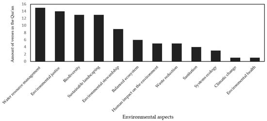 This review identified 42 chapters out of 114 chapters and 89 relevant verses out of a total of 6236 verses (Figure 8) that mentioned environmental aspects, including: (i) 15 verses emphasing the importance of water resource management; (ii) 14 verses on environmental justice, including earth jurisprudence; (iii) 13 verses on the importance of biodiversity, including plant conservation and conservation biology; (iv) 13 verses on sustainable landscaping, including gardening; (v) 9 verses on environmental stewardship; (vi) 6 verses on the importance of a balanced ecosystem; (vii) 5 verses on the human impact on the environment; (viii) 5 verses on overconsumption, including waste reduction; (ix) 4 verses on sanitation; (x) 3 verses on the importance of system ecology, including planetary homeostasis and the Gaia hypothesis; and (xi) 1 verse on climatic change. One verse in Surah A-Hijr (15:22) was identified as contradictory to all relevant verses because it mentioned environmental health (Figure 8).