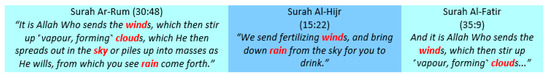 At the beginning of the discovery, scientists hypothesised that the wind in the rain process was only a cloud mover. In the 20th century, with more modern equipment, such as airplanes, satellites, and computers, it was only then that scientists discovered that wind had a significant function in the process of rain formation, combining the water vapour floating in the air with the particles it brings from the sea to finally help the formation of rain clouds. The discovery of this rain process was something that amazed Western researchers. Meanwhile, the process of rain formation has been clearly written in the Qur’an for 1400 years, namely in Surah Ar-Ruum (30:48). Research found that wind in the process of rain formation was only a cloud mover (Guzzetti et al. 2022; Renato Morbidelli 2022). Meanwhile, in the Al-Qur’an, Surah Al-Hijr (15:220) explains that wind is a carrier of water (clouds). Furthermore, Allah tells about the wind that moves the clouds in Surah Al-Faatir (35:9) (Figure 11).