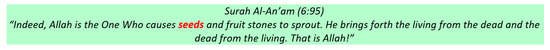 There is a strong relationship between the increase in sunlight and the formation of seeds and plants because light is a basic element in plant growth (Xu et al. 2021). Seeds and plants require food that consists of earth elements, including sunlight (Reed et al. 2022). Sunlight acts on the chlorophyll produced by plants to produce food that is absorbed into the roots of the plants (Yano et al. 2022). This process is important for the plant’s survival and fertilisation. This finding has been suggested by the Qur’an, which also describes seed germination in Surah Al-An’am (6:95) (Figure 13).