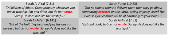 The Qur’an also mentions waste minimisation (Figure 16). Reading through each of the Qur’an’s citations reveals that the environment as described in the Qur’an is not independent, but rather synergistically interdependent. Waste reduction reduces man’s impact on the environment, helping to promote a more balanced ecosystem and maintain planetary homeostasis. Waste reduction reflects the efficient use of natural resources and, thus, the sustainability of the environment from pollution. Furthermore, for instance, excessive disposal of industrial waste into the environment without treatment can harm water and plants as well as soil fertility (Koul et al. 2022).