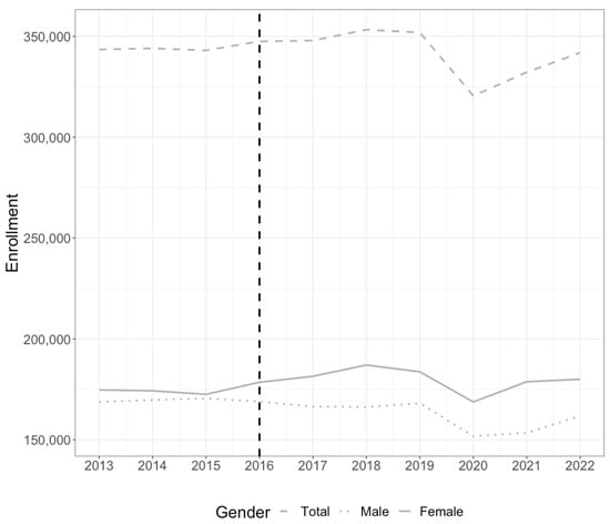 One question that we have not yet analyzed concerns the selection into the benefit pool, both in terms of the size of the pool and the characteristics of the beneficiaries. Do some groups have greater access or make greater use of the policy? Although the policy was designed with reference only to the income level of the student’s family, we might expect that patterns of inequality and bias would be replicated in the uptake of the policy, with women and indigenous people less likely to become beneficiaries. We examine this in two ways. First, using administrative data from the National Council of Education (CNED for its initials in Spanish), we explore first-year enrollment in Figure 1 over the years 2013 to 2022. This encompasses the years before the introduction of the gratuity policy to the years after its implementation.