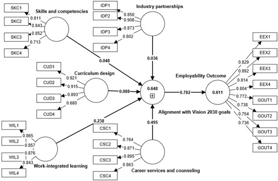 Table 5 demonstrate the explanatory power of the independent variables on the dependent variable, “Employability Outcome.” The R-square and R-square adjusted values indicate that the model explains a significant portion of the variance in the dependent variable. Specifically, the model explains 64.8% of the variance in the employability outcome, which is a high degree of variance. Additionally, the f2 values show that the independent variables, “Alignment with Vision 2030 Goals,” “Career Self-Management,” “Career Understanding and Decision-Making,” “Industry Demand and Professionalism,” “Skill and Knowledge Competence,” and “Work-Integrated Learning” have a moderate to high explanatory power over the dependent variable. Overall, these results suggest that the independent variables have a strong impact on the employability outcome of graduates, highlighting the importance of these variables in improving graduates’ employability.