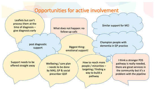The discussion raised a number of different strands including needs, barriers, concerns and, most importantly, opportunities and solutions. There was a clear agreement among participants that people need support immediately after the diagnosis to feel safe and supported, and that, at present, this was often missing. While participants felt that there are great community services, they observed that there is “a problem with the pipeline” (Figure 5), and that a model is still missing that connects people with the support on offer following their diagnosis through memory assessment services (MAS).