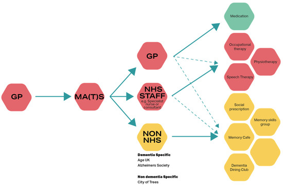 Considering existing services was deemed important because of the size and complex structure of health and care services in Greater Manchester. With ca. 2.8 million people (Office of National Statistics 2021), it is the biggest conurbation in the UK outside of London. It comprises 10 boroughs in which health care is provided by two National Health Service (NHS) Trusts: Greater Manchester Mental Health NHS Foundation Trust (Bolton, Salford, Manchester, Wigan and Trafford) and Pennine Care NHS Foundation Trust (Bury, Rochdale, Oldham, Tameside and Stockport). Within this system, the different boroughs offer different systems and levels of provision, with the approach and treatment of those with dementia differing according to local priorities. Nevertheless, there are some similarities. In general, the current pathway to a dementia diagnosis and treatment is to go to the GP who refers the person to the MAS1. Once the memory assessment is completed, the pathway diverges dependent upon location and other factors with referral back to the GP, to specialist NHS staff or to non-NHS organisations, such as social prescribers or dementia and volunteer organisations. Treatments offered vary and include medication, therapies and social activities.