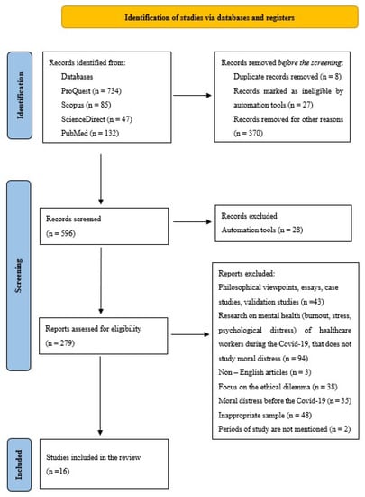 In the first stage of research identification, 1001 articles complying with the proposed keywords were found. Two independent librarians performed an initial, manual selection of studies from the articles (n = 596) that remained after the screening. Titles and summaries of selected studies were reviewed along with their compliance with predefined criteria: COVID-19 pandemic, moral distress, and healthcare workers. As a result, articles that did not mention moral distress during the COVID-19 pandemic were excluded (n = 289). The automation tool, in its turn, excluded additional articles (n = 28).