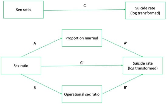 Our analyses utilize a parallel/multiple mediation model approach (Baron and Kenny 1986). Our models examine the pathway from sex ratio to suicide rates through our two mediating variables, proportion married and operational sex ratio (OSR), using four multilevel regression equations: (1) a model predicting suicide rates without mediators, same model as described in previous section (see Figure 1, line C); (2 and 3) models of sex ratio predicting the mediators (see Figure 1, lines A and B); and (4) a full model predicting suicide rates with mediators and sex ratio (see Figure 1, lines A’, B’, and C’). All models include a random intercept for US state and control variables listed above. The analyses were attempted utilizing generalized structural equation modeling; however, convergence could not be achieved with these models. We therefore utilize separate linear mixed-effects models with random intercepts.