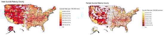 Male (left) and female (right) suicide rate (ages 15–74) by US county. White blocks represent counties with missing data (fewer than ten suicides over a 20-year period).