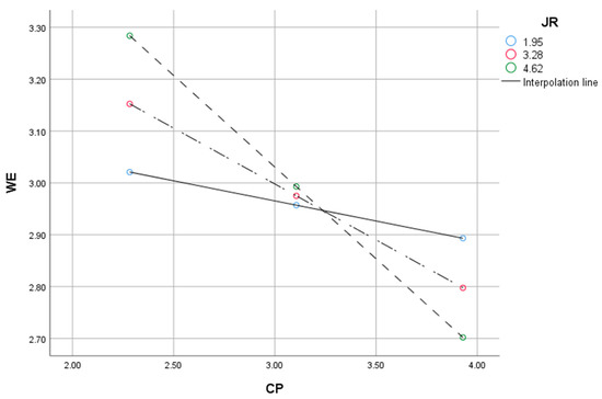 Finally, SPSS 26. PROCESE 2.16 software was used to analyze the moderating effects of training and job rotation on career plateaus, work engagement, job burnout, and turnover intention (see Table 6). Training negatively moderated career plateau toward job burnout (R = −0.076), and job rotation negatively moderated career plateau toward work engagement (R = −0.103). Therefore, we assumed that H8a and H9b were supported, but H8b and H9a were not supported. Figure 2 and Figure 3 show the moderating effect.