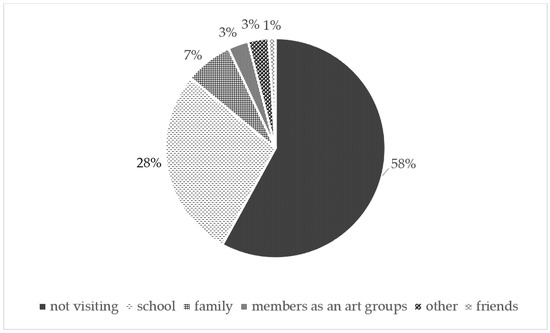 Bauer’s (2019) research concluded that theatre visits often occur with the family, while other art venues, such as concert halls and museums, are typically visited with school organisations. The role of the school was also found to be significant in the DEXARTA survey, with 70% of pupils having attended different art events together with their school classes (Váradi 2020a). The results of the research suggest that the role of family, parents, grandparents, and relatives at this age is not as significant as that of school.