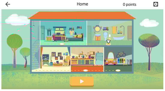 The result of the implemented EDR approach is the DER “Sustainability at Play” game. In this game, children are asked to go through a narrative of a day in six different scenarios at home (bathroom, bedroom, kitchen, garage, living room) and at school (classroom). There is a total of nine everyday situations in the different scenarios, with a total of 20 situations to choose from. The player is challenged, in the different scenarios, to choose products and goods (toothpaste, jeans, milk, books), which they consume at different times of their day (dressing, hygiene, meals, traveling). As initial support, hints are provided to help players understand the dynamics and the objective of the game in question, as illustrated in