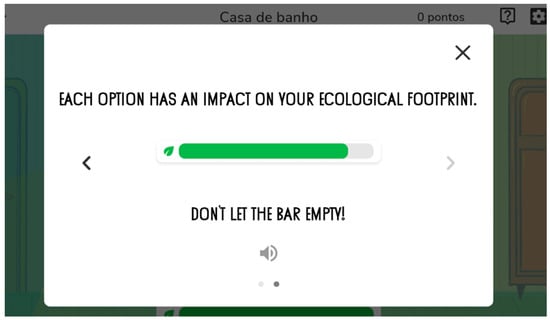 Figure 4). Depending on the player’s choices and the smaller or larger the ecological footprint, the player accumulates points and the EF bar decreases. The game is interrupted and ends if the player exhausts the EF bar.