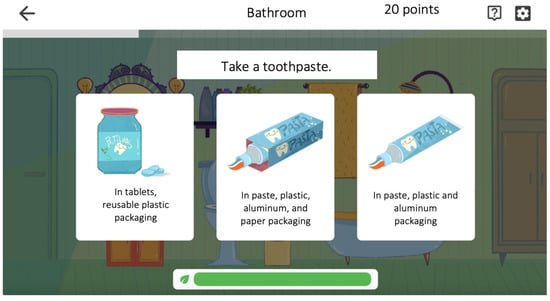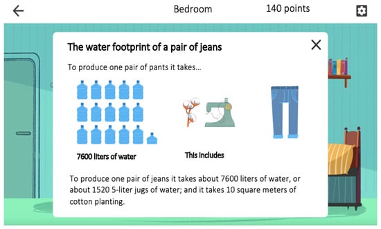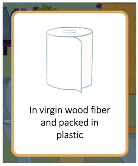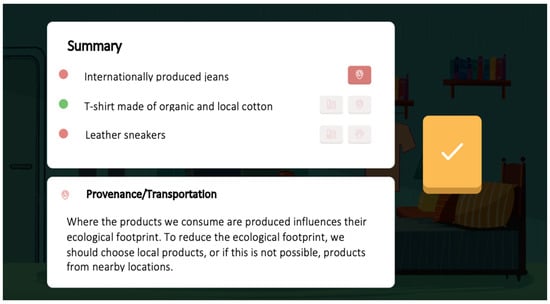 Figure 6), where, through the information provided to them about each of the products and goods they choose, the player can identify how everyday choices contribute to managing the EF in order to have as little impact as possible (e.g., the material and shape of the packaging, the place of origin, whether the food is in season or not).