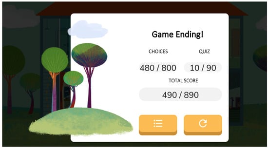 At the end of the game, a summary of the score of the player’s choices, the bonus quizzes, and the final score appears (