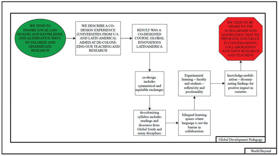 The graphic depiction (Figure 1 below) of paper one (Smith et al. 2021) designates Global Development Pedagogy as the system and the World Beyond as its environment. The macro and micro levels of Global Development Pedagogy correspond, respectively, to the broader rationale for de-colonizing research collaborations and the way this course was constructed, including outcomes. Analysis begins with the central problem the pedagogical project was trying to address—that local languages and knowledge are often missing from research, and thus the sources that students read and are taught to valorize are not diverse or inclusive. The pedagogical project was thus approached with a commitment to co-design the course with colleagues from the U.S. and Latin America, which included providing all reading material in English and Spanish. Another main element of de-colonizing the syllabus was to feature readings from Latin America and from many disciplines. Both faculty and students engaged in reflexive positionality exercises, examining their backgrounds and identities, how others perceive them, and how this might influence their research. The idea of symmetrical exchange is emphasized and visible in the central plain box of the graphic, and the faculty teams were conscious of this throughout the entire process of designing and teaching the course.