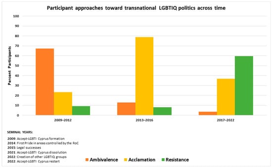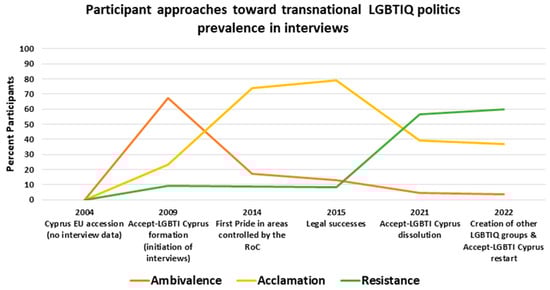 Three main themes were identified from the material from the 100 interviews conducted over 13 years, named as follows: Ambivalence toward transnational LGBTIQ politics; acclamation of transnational LGBTIQ politics; and resistance toward transnational LGBTIQ politics. I discuss the three approaches toward LGBTIQ politics in this order in the following three subsections.7 A visual representation of the development and transformation of these approaches over time and of when they became more prevalent in interviews can be seen in Figure 1 and Figure 2 below.