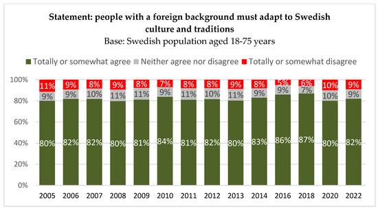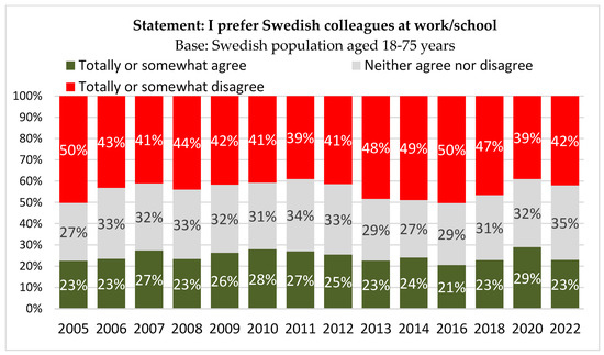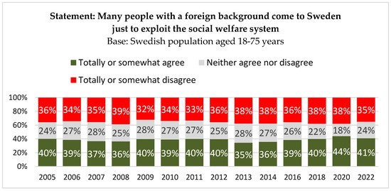There seems to exist a tendency of suspicion that people with a foreign background come to Sweden to exploit the country’s social welfare system. Since 2005, a relatively stable number of respondents (36–44%) partially or totally agree with the statement that many people with a foreign background come to Sweden to exploit the social welfare system. Moreover, a relatively large number of respondents (24–28%, except for 2020) are indifferent toward the negative statement on the exploitation of social welfare (Figure 1). This result means that only about 35–38% distance themselves from the negative statement concerning exploiting the social welfare system.