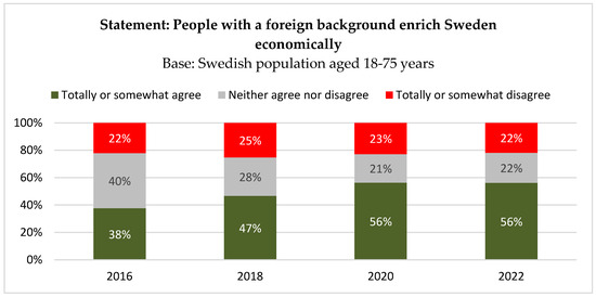 The involvement of people with a foreign background in working life seems to be appreciated, given that immigrants contribute the labour necessary for the economy. There has been a successive increase in the percentage of Swedes who believe that people with foreign backgrounds enrich Sweden’s economy, from 38% in 2016 to 56% in 2022. However, the percentage who completely or partially disagree has been constant between 22% and 25% (Figure 2).