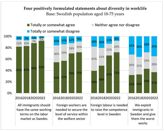 Having in mind that almost half of the respondents agree, at least between 2018–2022, with the positive statement about immigrants enriching the Swedish economy (Figure 2), there is a significant perception, between 33–43% of respondents during 2018–2022, that immigrants are exploited and given the worst jobs (Figure 3). Adding those respondents that are indifferent or do not know or probably suspect it, the number of respondents increases to over 60%. Suppose we contrast that result with the statement that all immigrants should have the same working terms as Swedes, it can be possibly discerned that the responses are based on the self-image of Swedes as just and rightful.