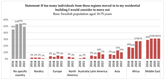 A probable indication of immigrants’ undesirability is shown by Swedes’ readiness to exit if immigrants join the spaces the Swedes occupy. For instance, Figure 9 illustrates that while the majority of respondents in 2022 would not contemplate relocating to another residential area if a substantial number of immigrants, irrespective of the country of origin, moved into their residential building, a noteworthy 49% expressed openness to relocating. The figure further suggests an embedded ethnic and religious hierarchy of immigrants’ desirability and tolerability depending on their place of origin, with immigrants from the Middle East and Africa being the least tolerable or desirable.