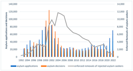 Asylum applications, decisions, and enforced removals of rejected asylum seekers from the UK 1992–2022 (source: produced by authors using data from Home Office (2013–2023).