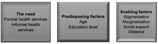 In this study, Andersen and Newman’s seeking behavior model framework was used to explain the objectives (Andersen 1995; Andersen and Newman 1973). This entails that the type of healthcare services consulted represents the need, the determinants represent the predisposing factors, and the challenges represent the enabling factors. Thus, the theoretical framework-based findings of this study may be presented in Figure 2 below, where the need, predisposing factors, and enabling factors are themes and their accompanying sub-themes.