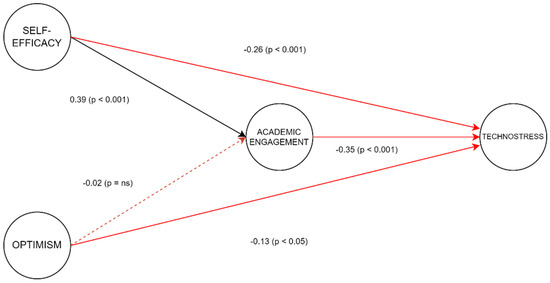 The SEM model highlighted good fit indices (Kline 2016), with CFI = 0.949, TLI = 0.938, SRMR = 0.052, RMSEA = 0.050, 90% CI (RMSEA) = [0.041; 0.059]. The measurement model also revealed that all item loadings on latent constructs were significant. In particular, for self-efficacy, the range of standardized loadings is [0.64; 0.85], for optimism [0.41; 0.89], for academic engagement [0.40; 0.87], and for technostress [0.42; 0.77].