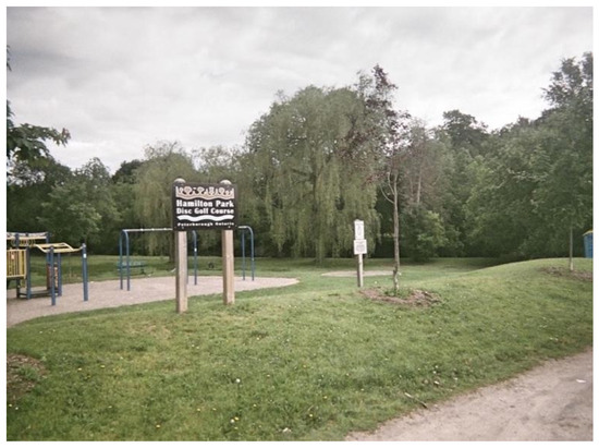 “Hamilton Park”. Daniel’s entry: Children enjoying themselves when school’s out. I love taking my grandchildren. It is a place of happiness, and you leave with a smile. Image Description: A park with a playground in the background. A wooden sign reads “Hamilton Park”.