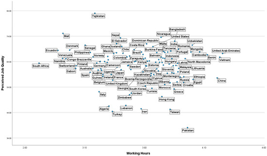 The weekly working hours scores (ranging between 1 and 5) were averaged in each country to construct a measure of national working hours (M = 3.566, SD = 0.314). Higher scores indicate longer working hours per week. The national scores are shown in Figure 2 and Table S2. Working hours and job quality were not significantly correlated (Spearman r = −0.088). Figure 3 shows that the association between working hours and job quality at the national level was trivial.
