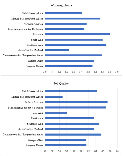 Figure 4 shows the average job quality and working hours in 11 world regions. Working hours were longest in East Asia and shortest in Australia and New Zealand. Perceived job quality was highest in North America and lowest in the Middle East and North Africa. Table S3 shows the countries that fall into each of the regions.
