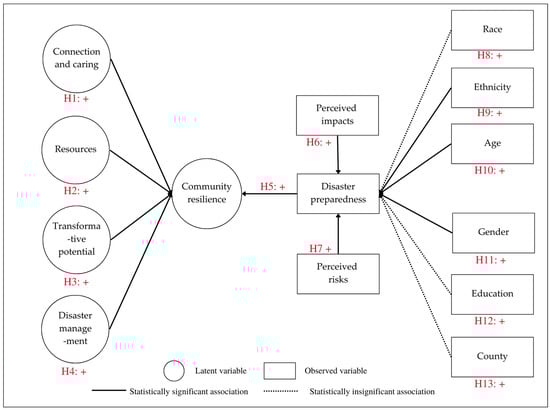 The results of the SEM analysis are presented in Table 4. The estimates column provides values for coefficients β, β1, β2, β3, β4, β5, β6, β7, β8, β9, β10, β11, and β12, indicating relationships between independent and dependent variables, while the Std. Err. column presents standard errors for these coefficients, and the subsequent columns offer z-values, 2-tailed p-values for null hypothesis testing (coefficients being 0), and 95% confidence intervals to gauge parameter range. First, individual preparedness has a positive association with perceived risk (β6 = 0.131, z = 3.24, p < 0.001), being female (β11 = 0.219, z = −4.3, p < 0.01), and age (β10 = 0.195, z = 5.14, p < 0.001), and a negative association with perceived severity of impacts (β7 = −0.092, z = −2.33, p < 0.05) and being Hispanic (β9 = −0.114, z = −3.00, p < 0.01) (Table 4). The four domains, which were measured as latent variables, Connection and Caring (β1 = 0.418, z = 10.300, p < 0.001), Resources (β2 = 0.612, z = 17.650, p < 0.001), Transformative Potential (β3 = 0.884, z = 38.900, p < 0.001), and Disaster Management (β4 = 0.802, z = 33.680, p < 0.001) show a positive association with community resilience (Table 4).