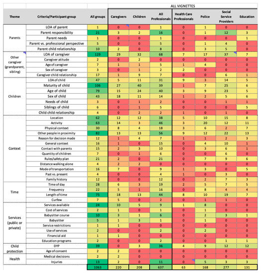 Compared to the professionals, caregivers and children did not volunteer criteria about parents (except a handful of mentions in regards to parent responsibility and parent-child relationship by caregivers), or family history. Children did not mention any criteria related to health, and only a few pertaining to services and context. In fact, young people focused largely on the level of ability of the caregiver, the maturity and age of the child, the location where the scenario took place, and the duration of the activity/situation described. As for caregivers, the main criteria used to assess appropriateness of care included the caregiver’s level of ability; the maturity, age, and sex of the child; the duration and location of the activity described; and the services available.