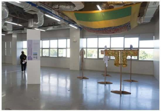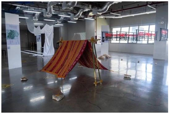 Equanimity was the concept structuring the installation for the fourth site, which included autobiographical recollection, embroidery on garments, annotated maps, woodworking, and an installation of a traditional Tausug appliqued canopy (luhul) (see Figure 4). This installation reflected on the loss, reconfiguration, and recreation of identities women faced when joining armed groups. For the installation, women donated a uniform they used at the time of war, which they embroidered with their names, to tell stories that ought to be understood as a form of memorialization as much as an ongoing reality of negotiating identities.
