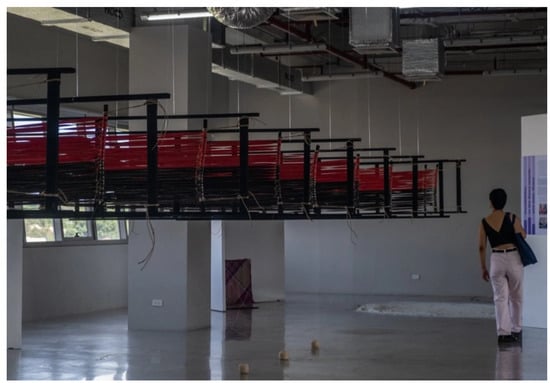 The previous section highlighted the importance of spaces and places in shaping both the interventions and the narratives emerging from these, for example, because every workshop took place in a locality related to the violent events or started with a mapping exercise. The spatial characteristics of the exhibition, however, were turned into constitutive elements of how multilayered and dynamic narratives of violence and resistance were ‘presenced’ in ways that envisioned active listening. This is best illustrated by comparing the two different spaces in which the physical exhibition was mounted. The first time, the exhibition was set up in multipurpose spaces and classrooms of Ateneo de Manila. This was approached by curators as an invitation to envision an approach that would work in informal spaces, and that would allow the exhibition to also travel to communities where formal art spaces or museums might not be available. The spatial constraints encouraged the foregrounding of other than just aesthetic qualities to express these narratives in meaningful and powerful ways that required a more active role of audiences.15 The second time, the exhibition was mounted in a more conventional art space, which had visual advantages but also reproduced the atmosphere of a museum and carried the risk that installations would be seen as ‘dead objects’ rather than as interventions that require active participation. Curators mitigated potential undesirable consequences of this spatial reality by, for example, ensuring that text interventions would be limited so that visitors would actively have to search for explanations and context, and by developing a printed resource for visitors to take home in order to allow for narratives—that often defy easy or immediate understanding—to travel and be processed also beyond and outside of the museum space.16