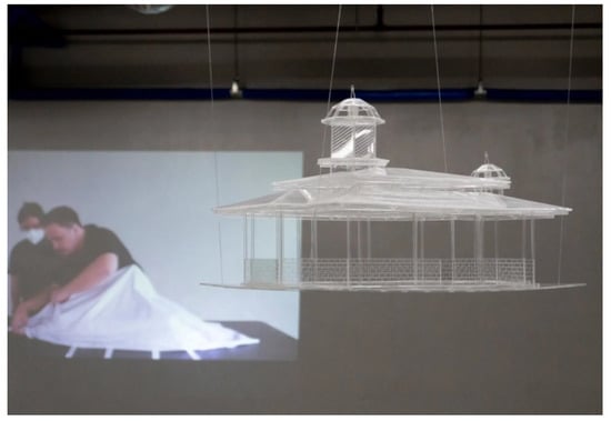 A sixth and last installation, revolving around the notion of amplification, contained autobiographical recollection, digital architectural renderings, acrylic and wood architectural modeling, annotated maps, embroidery, and an installation (see Figure 6). The artwork dealt with past and ongoing military action in the region and underlined the fear of repetition created by the blind spot in the national imagination about past massacres brought on by the Ilagâ. At the same time, the artwork also questioned the dynamics of memory and the truthfulness of remembering (see below).
