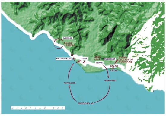 Throughout, maps and the practice of mapping played a crucial role in defining the memorial practice and installation. With each of the six groups of women, the team first engaged in a geographical mapping of stories, to make visible experiences in ways that are not linear or narrative, per se, but that follow a place-based logic (see Figure 7). In doing so, the narratives, memories, and memorial practices emerging throughout the process have an inherent place-based dimension to them, even if some final outcomes, like the online museum, are entirely untethered from the places and spaces in which these stories emerged. Maps were used to detail the locations of activities of participants in combat, to identify relevant and constitutive spaces in women’s lives, to overlay individual and personal maps with collective trajectories and geographies, or to bring that which was invisible because it happened in remote spaces back into the conversation. An example of the latter is Map 5 which shows the trajectory of the Mindoro ship (see Figure 8). Most narratives of violence regarding the Palimbang massacre focus on the killing of men in the Taqbil Mosque. Simultaneously, however, women and children were taken to a naval landing ship, the Mindoro, for weeks, where they experienced rape, forced marriages, hunger, psychological violence, and torture. Their remoteness at sea rendered this violence invisible. Starting from a mapping exercise, facilitators sought to counter this invisibilization. Also, other mapping exercises offered non-verbal tools to present a personal or collective experience as part of a broader dynamic of place-based and cultural violence. While facilitators started from place-based approaches, they also moved beyond these to avoid the entrapment of stories, experiences, and narrators in frameworks typically associated with these place-based practices, and to propose new interpretations, formulations, and ways of imagining. This interaction between place-based and non-place-based approaches could be observed in the process as well as the outcome, where, for example, several installations could be read as stand-alone non-place-based interventions, as well as being components of a greater place-based memorial structure. This combination of place-based and non-place-based approaches to memorialization and ‘presencing’ sought to reflect layers and complexity that otherwise risk being overlooked.