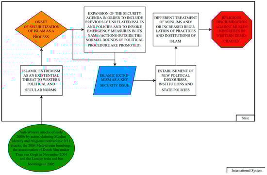 Figure 1 displays the main arguments from Fox and Akbaba (2015b).4 Fox and Akbaba (2015b, pp. 175–76) posed the following interrelated questions: “Do Western democracies treat Muslims differently than other religious minorities? Has this treatment changed since 2001? If so, are these changes consistent with the proposition that Islam has become securitized in the post-9/11 era?”. Fox and Akbaba (2015b) looked into 27 Western democracies over 19 years to trace changes in their treatment of religious minorities since the 9/11 attacks. Anti-Western attacks changed threat perception and shifted “discourses”, “policies” and “institutions” in a way that restricted Muslims more than other faith groups (Fox and Akbaba 2015b, p. 175). While a general rise in religious discrimination against minorities became apparent, “it increased disproportionately against Muslims primarily after 2001” (Fox and Akbaba 2015b, p. 176). The focus is on state-based religious discrimination, which is defined as “restrictions placed on the religious practices and institutions of each religious minority in a country which are not also placed on the majority religion” (Fox and Akbaba 2015b, p. 176). Religious discrimination is measured with 29 specific faith-based restriction variables that target minority religions.