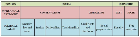 In order to account for the differing socio-political trajectories and attitudes in a post-Socialist state, Bulgaria, a political values-based approach to measuring political attitudes and ideological orientation in this country has been developed. In the proposed conceptualization, each of the four ideological dimensions, or categories (Left, Right, Liberalism, and Conservatism), includes political values characterized by opposite motivational content and socio-political goals vis-à-vis their antagonists within the two bipolar dimensions: left/right in the economic sphere and Liberalism/Conservatism in the social sphere (Figure 2).