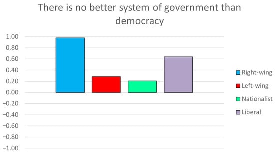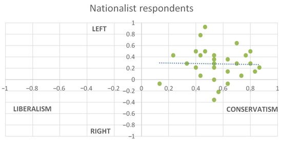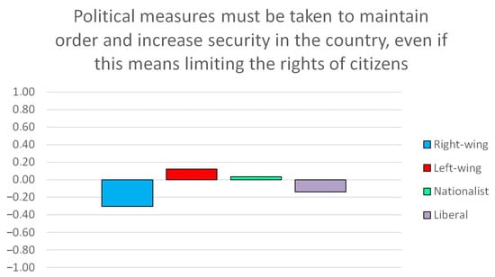 Results for the Civil Rights political value are evidence of the grouping of parties into two main blocks according to their members’ degree of commitment to liberal democracy and civil rights. The high scores of right-wing party members and liberals are in contrast with the much lower values of trust in democratic principles and their application in the country, characteristic of both leftists and nationalists (Figure 3). Although the values of the representatives of all parties participating in the study are positive, i.e., they more or less support the values accepted as fundamental in Western democratic societies, the representatives of right-wing parties stand out as the most prominent supporters of the principles of the liberal democratic state, followed by liberals.
