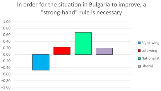 Left-wing party members also express support for the idea of a “strong-hand rule” in Bulgaria as the only viable option to address the demographic, social, and political crises (or “catastrophes,” according to the nationalist discourse) that have been plaguing the country—a position that is also supported in an equal measure by liberal respondents, and adamantly rejected by right-wing democrats (Figure 7). Such extreme statist attitudes in support of a highly centralized and even authoritarian government—a “power vertical” similar to the political system of the Russian Federation, were freely discussed during in-depth interviews with nationalists, leftists, and liberals, which provided ample empirical material for the reconsideration of the application of ideological labels in Bulgaria.
