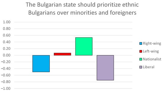 Regarding Ethnic Nationalism, the refusal by the majority of leftists to reject explicitly the openly discriminatory (yet common among Bulgarian nationalists) idea that the Bulgarian state should prioritize ethnic Bulgarians over minorities and immigrants (Figure 8) supports the initial hypothesis regarding the popularity of nationalist sentiments among left-wingers and confirms the usefulness of the political-values approach to measuring political attitudes and ideological orientation in Bulgaria for identifying the ensemble of conservative political values in the country.